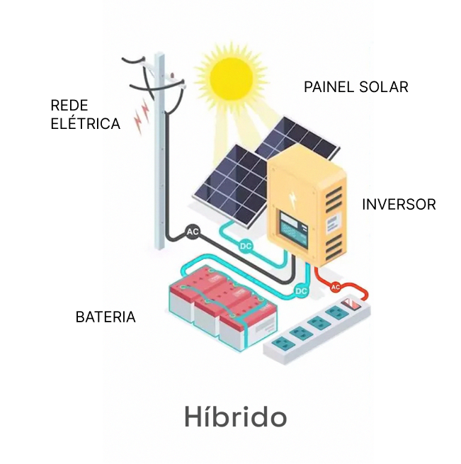 O sistema híbrido conjuga o uso da rede da concessionária com um banco de baterias trazendo uma melhora na eficiência energética, mesmo nos casos de interrupção de fornecimento da rede externa.