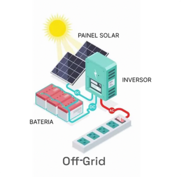 Funciona sem conexão com a rede elétrica, armazenando a energia em baterias para consumo posterior quando o sol não está brilhando.